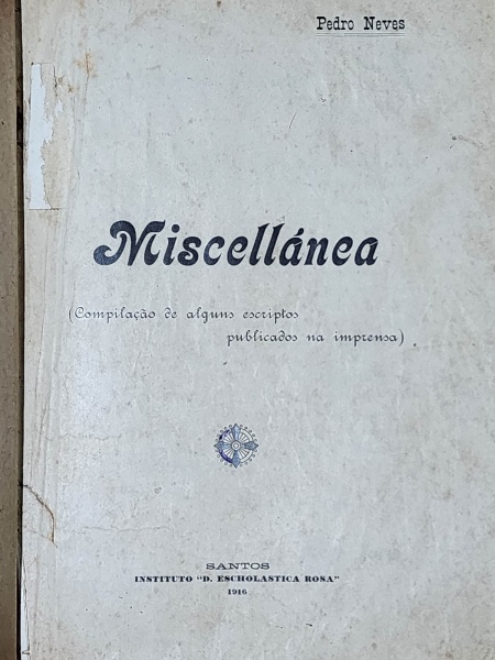 • Pedro Neves - Miscellánea - Santos 1916 - 1a. ed. - Encadernado - bom exemplar, sinal de acidificação, algumas anotações manuscritas, encadernação com, danos, marcas do tempo.